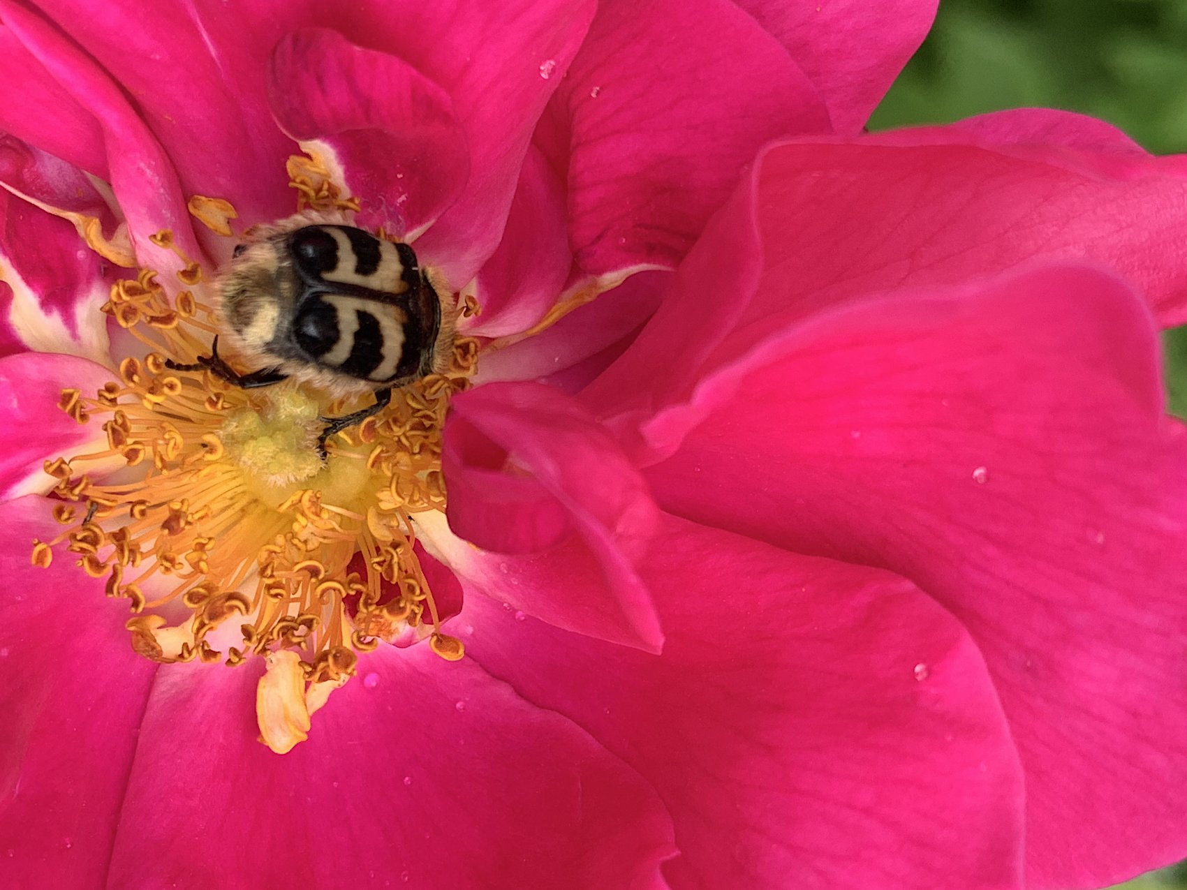 Ja die Familie ist die gleiche, gefühlsmässig gehört er für mich nicht zu den Junikäfern. Er scheint kein Schädling zu sein, soweit ich das beobachtet habe frisst er sich durch die Pollen, wie Bienen und Hummeln.