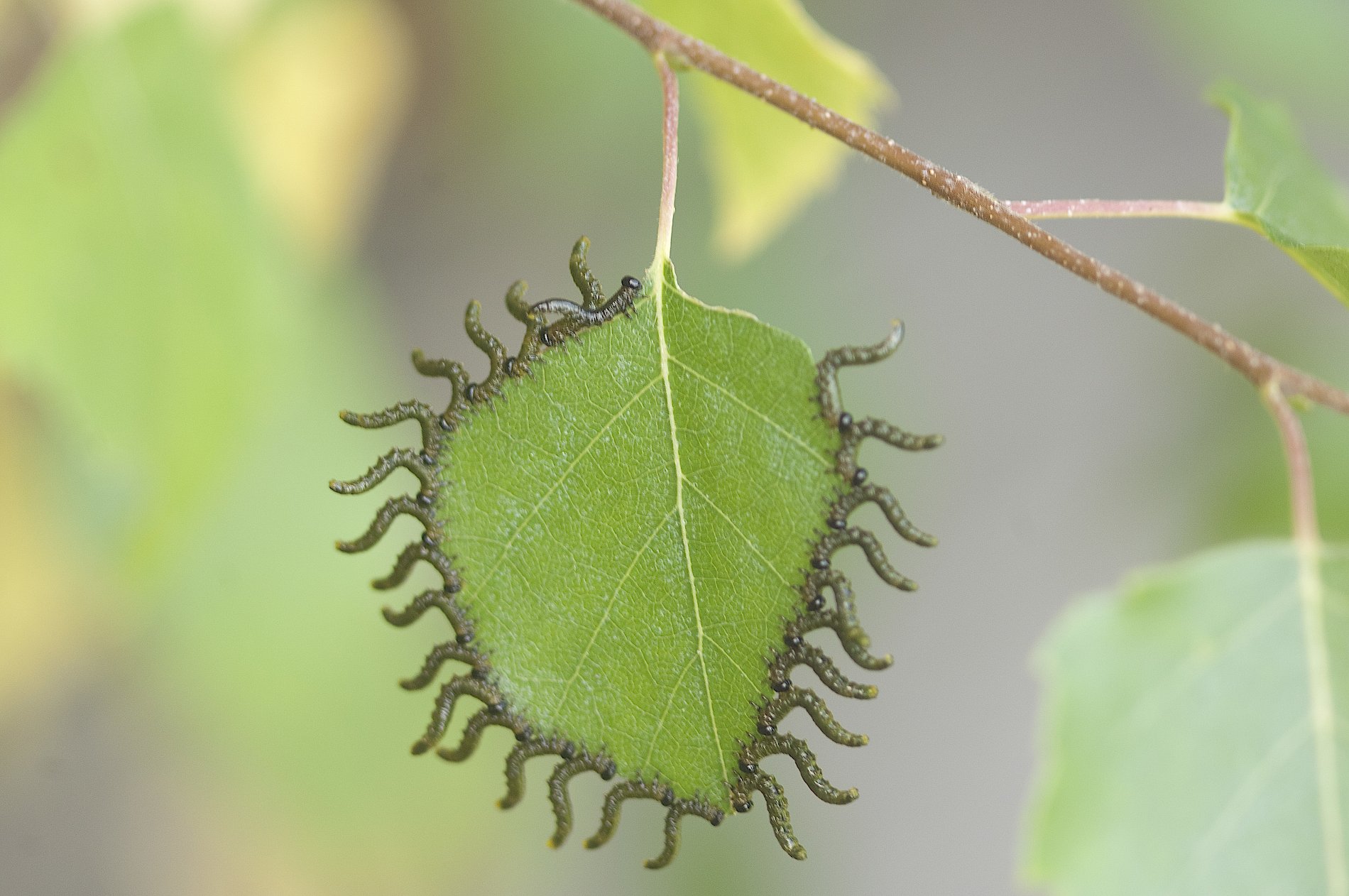 Wir hatten mal an einer Birke eine Raupenart, die am Rand des Blattes der Reihe nach nach oben gebogen waren. Wenn ich das Bild noch finde schick ich es Dir.