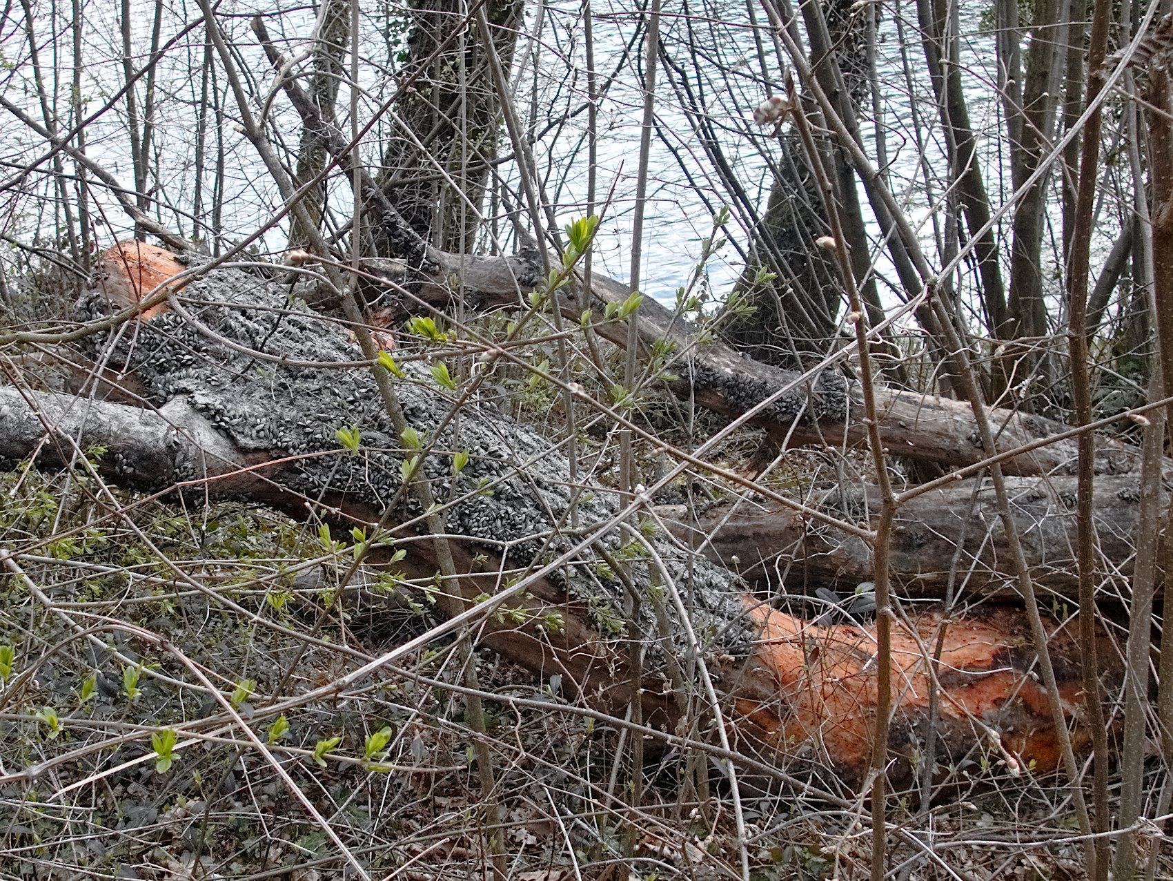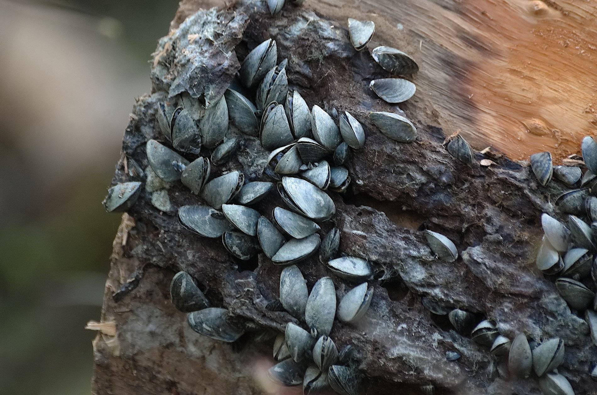 So sieht das aus, wenn ein Baumstamm längere Zeit im Rotsee gelegen hat. Bei den Muscheln handelt es sich um Wandermuscheln, die ursprünglich in den Flüssen rund um das Kaspische Meer beheimatet waren und ab ca. 1960 in die Schweiz eingeschleppt wurden. Im Vierwaldstättersee wurden sie 1974 zum ersten Mal entdeckt, über den Rotsee konnte ich dazu nichts finden. Im Falle des Rotsees spekulieren Experten, dass die Larven mit den Ruderbooten bei den hier regelmässig durchgeführten Ruderregatten mitgereist sind. Das ist aber nur Spekulation, sicher weiss man das nicht. Auf jeden Fall breiteten sie sich schnell aus; eine Wandermuschel kann pro Jahr bis zu einer Million Eier produzieren. Sie zählt zu den invasiven Arten und kann die Artenvielfalt stören, da sie sich an Wasserpflanzen und grösseren Muscheln anheftet.